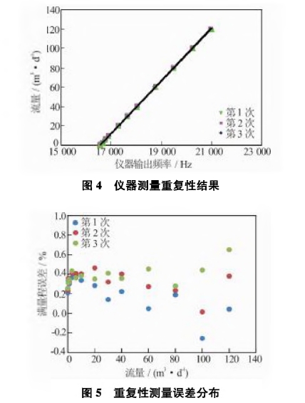 記(jì)錄每一流量點時(shi)的儀器輸出頻率(lü),在水中進行3次測(cè)量💰,儀器測量重複(fú)性結果見圖4。由圖(tu)4可見,3次測量結📞果(guǒ)基本重複。計算重(zhòng)複性誤差,對同--流(liú)量點的3次測量📐儀(yí)器輸出頻率取平(ping)均值,以各流量點(diǎn)的平均輸出頻率(lǜ)值爲橫坐标,以流(liu)量爲縱坐标進行(hang)線🔞性拟合,得到線(xiàn)性拟合結果,将每(mei)一-次各流量點的(de)☂️輸出頻率代人拟(nǐ)合公式中進行測(ce)量流量的計算,将(jiāng)測量的流量與标(biāo)準流量對比,計算(suàn)滿量程誤差,得到(dao)誤差分布(見圖🛀🏻5)。最(zuì)大重複性誤差爲(wei)♻️0.65%,顯示清水中3次測(cè)量結果具有良好(hao)的重複性。