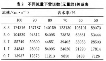 雷諾數(shù)是表征流(liu)體流動情(qíng)況的無量(liàng)綱數。雷諾(nuo)數較小時(shi),黏滞力對(dui)流場的影(ying)響大于慣(guan)性力,流場(chang)中流速的(de)擾動會因(yīn)黏滞力而(ér)衰減,流體(ti)流動穩定(ding),爲層流;反(fan)之,若雷諾(nuo)數較大時(shí),慣性力對(dui)流場的影(ying)響大于黏(nian)滞力,流體(tǐ)流動不穩(wen)定,流速的(de)微小變化(huà)容易發展(zhǎn).增強,形成(cheng)紊亂、不規(gui)則的湍流(liú)流場。流态(tai)轉變時的(de)雷諾數值(zhi)稱爲臨界(jie)雷諾數。一(yī)般管道雷(léi)諾數Re<2100爲層(céng)流狀态,Re>4000爲(wei)湍流狀态(tài),Re=2100~4000時爲過渡(du)狀态。表2列(liè)出不同含(hán)水率與不(bu)同流速下(xià)的雷諾數(shu)。