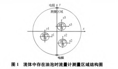 當(dang)電磁流量(liàng)計中心橫(heng)截面内含(hán)有M(M=0,1,2.,-.)個油泡(pào)時傳感器(qi)的權重函(han)數分布情(qíng)況,本文算(suan)例設定M=3權(quán)重函數分(fen)布情況計(jì)算方式。圖(tú)1爲電磁流(liú)量計傳感(gan)器截面内(nèi)存在3個球(qiú)形油泡時(shí)的結構模(mo)型圖。其中(zhong),x軸與y軸與(yu)圖1描述--緻(zhi),圖1中隻顯(xiǎn)示了測量(liang)區域部分(fen),測量區域(yu)流體中存(cún)在3個油泡(pào)。y正半軸、負(fu)半軸與管(guǎn)壁的交點(dian)是流量計(jì)的電極位(wèi)置。