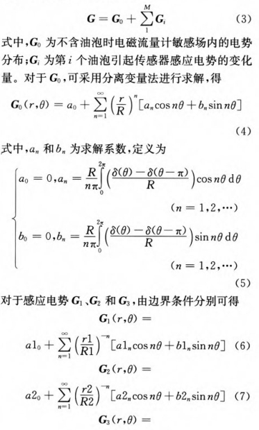 式中,R爲(wèi)電磁流量(liàng)計半徑的(de)長度值;მG/an爲(wèi)電勢在半(ban)徑方向上(shang)的導數;δ(θ)爲(wèi)電勢G在流(liú)量計管壁(bi)處所滿足(zu)的條件,其(qí)值僅在電(dian)極表面處(chu)不爲0。當流(liu)體中存在(zai)油泡時,G表(biao)達式爲