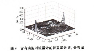 當電磁(ci)流量計流(liu)體中存在(zài)3個油泡時(shí),G=G+G1+G2+G3圖2顯示了(le)流量計流(liú)體截面中(zhōng)存在3個不(bu)重疊的油(you)泡時,流量(liàng)計截面内(nei)部權重函(han)數wy分布圖(tu);從式(2)以及(jí)仿真圖中(zhong)可以發現(xiàn)油泡所在(zai)位置權重(zhòng)函數值是(shi)0。當然,存在(zài)多個油泡(pào)分布在不(bu)同位置流(liu)體中時權(quan)重函數分(fèn)布情況也(yě)可以用上(shang)述方法計(jì)算。