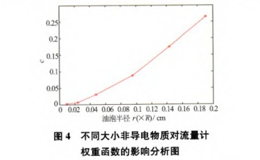 爲了更清(qīng)楚地揭示(shì)電磁流量(liang)計的權重(zhong)函數與流(liú)量計中非(fei)導電物質(zhi)半徑之間(jiān)的關系,定(ding)義c爲非導(dǎo)電物質對(duì)流量計權(quán)重函數的(de)影響的評(píng)價指标式(shi)中,Wxy爲含有(you)油泡等非(fei)導電物質(zhi)時電磁流(liu)量計在測(cè)量區域坐(zuo)标(x,y)的權重(zhong)函數;Wxy0爲電(diàn)磁流量計(ji)不含非導(dao)電物質時(shi)測量區域(yù)坐标(x,y)的權(quan)重函數;A爲(wèi)權重函數(shù)區域(測量(liàng)區域)。