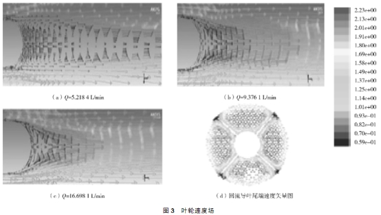 分(fen)别取流量爲5.2184L/min、9.3761L/min、16.6981L/min對葉(ye)輪流場仿真分析(xī),獲得上述流量下(xia)葉輪後導流架後(hou)端速度矢量圖(圖(tú)3(a),(b),(c)所示),可見流體與(yǔ)前導流架前端碰(pèng)撞産生低速區,靜(jing)壓力變大,且随🔴流(liu)量增大而變🌈大,壓(ya)力損失明♊顯;流體(tǐ)進入🌈前導流架👌後(hou),流速加快,雷諾數(shù)增加,湍流強度變(bian)大。流體進入葉輪(lun)前,先流經☂️葉輪與(yǔ)前後導流架連接(jie)的槽,由于槽内流(liu)速低,此時流量的(de)速度分布不均,且(qiě)有強渦流産生。回(hui)流導🈲葉尾端速🐕度(du)矢量圖如圖🤞3(d)所❓示(shi),流體在後導流架(jià)後端出現長尾🐆流(liu)🌈,尾流長度随流量(liàng)增大而減小。
