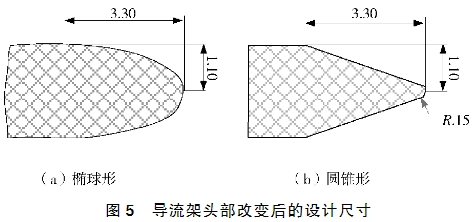 基于上述CFD仿(páng)真分析結果,爲有(you)效減小葉輪壓力(lì).損失,将原導🐇流架(jià)頭部的球形分别(bie)設計橢球型和圓(yuán)錐形,改進後的導(dǎo)流架頭部尺寸如(ru)圖5所示。