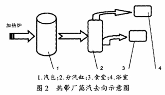 熱帶廠目前使用(yòng)的蒸汽主要由加(jiā)熱爐爐内管道汽(qì)化産生🐅,蒸汽過渡(du)儲存在汽包中。設(shè)計要求汽包工作(zuò)壓力爲0.50~0.80MPa,正常工作(zuò)壓力爲0.70MPa左右。汽包(bao)産生的蒸汽流量(liang)爲3.0t/h。蒸汽通過DN100的🈲管(guan)道輸送,蒸汽終端(duan)用戶爲食堂和浴(yu)室,蒸汽主要用于(yu)加熱。圖2對熱帶廠(chǎng)的蒸汽去向作了(le)⛹🏻♀️簡單的說明。.