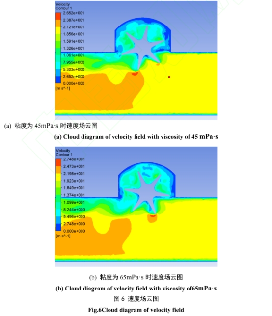 能夠發現(xiàn)在相同條(tiao)件下,粘度(du)65mPa·s下的葉輪(lún)附近最大(dà)速度爲27.5m/s,略(luè)高于粘度(du)45mPas下的26.5m/s,粘度(du)的升高導(dǎo)緻了流場(chang)流速的整(zheng)體升🌈高。分(fèn)析其原因(yīn)爲粘度的(de)升高使葉(ye)輪頂隙流(liú)體粘性阻(zu)力增大,減(jiǎn)小了間隙(xi)中的流體(tǐ)流量,從而(ér)使葉片表(biao)面流量增(zēng)加,導緻葉(yè)輪轉速小(xiao)幅上升。