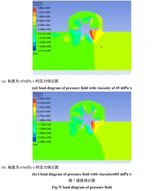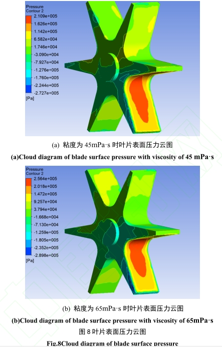 通過圖7所(suo)示的流量(liang)計的截面(miàn)壓力雲圖(tu)可知,渦輪(lún)🍉流🌈量計正(zhèng)常作業時(shi),整個腔體(tǐ)内的壓力(lì)分布較爲(wei)較爲均勻(yun),壓力場變(bian)化較大的(de)地方發生(shēng)在葉輪葉(yè)片與流體(tǐ)發生👨❤️👨沖擊(ji)的🔱--側,最大(da)💃壓力集中(zhōng)在葉片表(biao)面附近,粘(zhān)度65mPa·s.條件下(xia),葉輪表面(mian)處的最大(dà)壓力達到(dao)0.256MPa,高于粘度(dù)45mPa·s條件下的(de)0.195MPa,壓力從葉(ye)片表面向(xiang)外逐漸較(jiào)小。流體粘(zhān)度的升高(gāo)使葉輪附(fu)近流體阻(zǔ)力矩增大(da),導緻作用(yong)在葉片🔅表(biao)面的推動(dong)力增大,從(cóng)而葉片受(shòu)到的壓力(lì)增大。