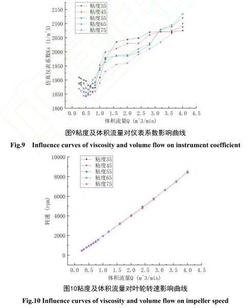 圖10爲葉輪(lun)轉速随體(tǐ)積流量的(de)變化關系(xi)圖,發現葉(yè)🔴輪轉速和(he)體積流量(liang)呈正比例(lì)增大關系(xì),受粘度變(bian)化影響較(jiào)小。