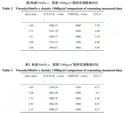 将實(shí)際固井作(zuo)業中采集(ji)到的兩組(zǔ)葉輪轉速(sù)數據🔞和仿(páng)真結果進(jìn)行對比,最(zuì)大誤差爲(wei)2.9%,最小誤差(chà)0.2%,平均❓誤差(cha)1.38%,仿真✌️數據(ju)和實測數(shù)據較爲接(jie)近,認爲所(suǒ)建立的仿(pang)真🏃🏻♂️模型具(jù)👅有精度。