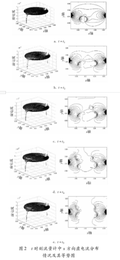 圖1所示(shi)爲流量計截面(miàn)中油氣泡非導(dǎo)電物質)增加與(yu)變化🌈時的Ansys仿真(zhēn)圖,圖la~e中分别顯(xian)示的是t1~t5時刻虛(xu)電流x方⭐向分量(liàng)的An-sys圖。