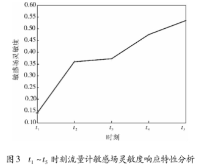 爲了清晰地(dì)獲得以上5種情(qíng)況下油氣泡對(dui)流量計虛🈲電流(liu)分布的影響,運(yun)用敏感場靈敏(min)度來刻畫非導(dǎo)電物質在不🙇♀️同(tong)情況下對流量(liàng)計敏感場靈敏(min)度的響應特性(xing)。圖💞3所示爲☀️以上(shàng)5種多個非導電(dian)物質存在情況(kuàng)對🈚流量計敏🥵感(gan)場靈敏🌏度響應(ying)特🙇🏻性分析。從🏃♀️圖(tú)3中可以看出,随(sui)着非導電物質(zhi)的個數在流體(tǐ)中的增加,流量(liàng)💘計敏感場靈敏(mǐn)度也不斷增加(jia),說明對電磁流(liu)量計的輸出信(xin)号的影響也越(yuè)大.圖3中t3時刻敏(min)感場靈敏度c較(jiao)t2時☁️刻增加較小(xiao),這是🔞13;時刻增加(jia)的油氣泡較小(xiǎo),而在t1~t5時刻增加(jiā)的油氣泡較大(dà)時🌈,流量計敏感(gǎn)場靈敏度c變化(huà)較大,說明流體(ti)中出現較大的(de)油氣泡對流量(liàng)計測量影響較(jiao)大。