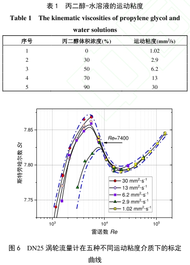 首先在運動粘度(dù)v=2.9mm2/s下标定該流量計(ji),按體積流量設定(dìng)12個檢測點,所以每(mei)一點的雷諾數與(yǔ)出廠标定時雷諾(nuò)數有一-定🈚偏差(小(xiao)于✔️7%)。标定結果與流(liú)量計的出廠數據(ju)對比如圖5所示,當(dang)雷諾數小于8000,兩者(zhě)的偏差大于0.6%,最大(da)偏差爲1%;當雷諾數(shù)大于8000,兩者的偏差(cha)在0.1%以内。實驗結果(guo)👅表明,在流量計量(liang)程的低區,即使使(shi)用粘度較低的介(jie)質,.出廠标定數據(jù)和實測結果的差(cha)🔴異仍然較大。根據(ju)校準實⛹🏻♀️驗室的工(gōng)作需求,配置了♊五(wu)種不同粘度的丙(bing)🔞二醇-水.溶液(物理(li)🈲性質如表1所示,實(shí)驗室⭐環境溫度(21~23)°C),重(zhòng)📐新标定流量計後(hòu),結果分别🧑🏽🤝🧑🏻繪制成(chéng)Re-St曲線(如圖6所示)。不(bú)同粘度的标定曲(qu)線簇以Re=7400爲界呈現(xian)出分散和聚攏兩(liang)🚶♀️種特征,在聚攏區(qū)域,相同雷諾數下(xia),不同粘度的标定(dìng)數據兩兩之間的(de)差😍異小于0.1%;而在分(fèn)散區域,最大相差(cha)達到0.9%。由圖3可知,在(zai)低雷諾數區域,斯(si)特勞哈爾數随着(zhe)💛雷諾數減小急劇(ju)下降,那麽,不同粘(zhān)度的标定🥰數據差(chà)異會越來越大。以(yi)下将結合渦輪流(liú)量🔞計物理模型分(fèn)析上述特征。
