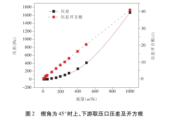 根據2.1參數(shu)設計,建立模型(xíng);分析類型選擇(zé)内部,排出内部(bù)不具備流動條(tiáo)件的腔,物理特(tè)征選擇瞬态分(fèn)析,分析總時間(jian)設定爲2s,輸出時(shi)間步長設定爲(wèi)0.02s;進行瞬态分😍析(xi)選擇☔流體介質(zhi)爲空氣,入口流(liu)量分别選💁取5m³/h、10m³/h、15m³/h.20m³/h、25m³/h、30m³/h、40m³/h.50m³/h、100m³/h、150m³/h、200m³/h、250m³/h、300m³/h、400m³/h、500m³/h、1000m³/h等(děng)16個流量點;如圖(tú)2所示,上、下遊取(qǔ)壓口壓差随着(zhe)人口流量的增(zēng)大呈增大趨勢(shì);設x爲各流量點(diǎn).單位📐爲m³/h,yw爲各流(liu)量點對應的上(shang)/下遊取壓口壓(ya)差值⭕、單位爲Pa,y爲(wei)xix0.5、單位爲Pa0.5。