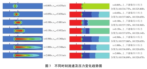 瞬态分(fèn)析如圖3所示,以(yǐ)了解孔闆流量(liàng)計在進行工作(zuo)🔞時✊,介質的🐆流動(dòng)狀态及壓力、速(sù)度實時分别情(qing)況。設定進口流(liu)量爲100m³/h,出口壓力(lì)條件爲标準大(da)氣壓、溫度爲20℃;孔(kǒng)🛀🏻闆流量♈計的結(jie)構設計造成氣(qi)流通道變窄(管(guan)道突然變徑),氣(qì)流進入管道短(duan)時間(0.005s)内上遊取(qǔ)壓口壓力突然(rán)增大,空氣流動(dòng)加劇,下遊⛷️管道(dao)壓力突👈然間變(bian)小形成負壓區(qu),但壓力分布不(bu)明顯,僅在孔闆(pan)口周圍形成不(bu)❗同壓力分層;下(xia)遊管道壓力出(chū)現明顯分層、且(qie)逐漸趨于穩定(dìng)。