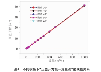 根據2.1參數設(she)計,建立模型,其(qi)他條件不變,隻(zhī)改變楔角的大(dà)小,分别取φ爲30°、40°.45°、50°、60°條(tiao)件下k系數的變(biàn)化規律;仿真流(liú)程如3.1所❤️述。得到(dào)結果如圖4所示(shi),不同楔角下,“壓(yā)差開方根-流量(liàng)點”均呈理想線(xiàn)性關系(R2=1),圖像幾(jǐ)乎是重合的,說(shuō)明楔角對h系數(shu)影響較小;線性(xìng)關系分别爲: