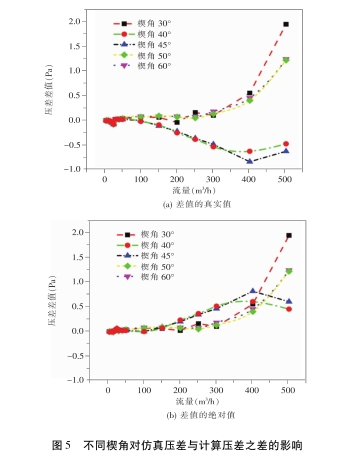 不難發現(xiàn):整體來看,不論(lun)楔角是哪一種(zhong)情況,在50m³/h以内✔️的(de)流☔量下,差值基(jī)本--緻,且均接近(jin)于0;随着流量的(de)逐漸增大,壓差(cha)差值🔴呈增大的(de)趨勢;楔角40°和楔(xiē)角45°條件下,差㊙️值(zhi)變化趨勢基本(běn)緻,且🚶♀️偏離方向(xiang)一緻;楔角☔50°與楔(xiē)角60°條件下,差值(zhí)🔞基本重合,且偏(piān)離方向一緻;楔(xiē)角30°對差值的影(ying)響最大,在流量(liang)爲500m³/h時,達到最大(dà)值1.94Pa。流量400m³/h是差值(zhí)的“拐點”,當楔角(jiǎo)爲40°、45°時,差值最大(dà),之後差值開始(shǐ)降低;當楔角❤️爲(wei)30°、50°、60°時,差值開始突(tu)然變大。