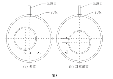 本文孔闆對中(zhōng)性是指在安裝(zhuang)孔闆或實驗室(shi)檢定孔闆時,孔(kǒng)闆孔口的中心(xīn)線與管道中心(xin)線--緻程度,将上(shàng)述中心線的偏(piān)離距離作爲試(shi)驗因子;如圖8所(suo)示,偏離分爲對(duì)稱偏離(DCPL)和偏離(lí)(PL)兩種;分别取偏(piān)離距離△x爲5mm、10mm、15mm.20mm,楔角(jiǎo)⁉️爲45°,介質爲空氣(qi)進行仿真實驗(yan)等。