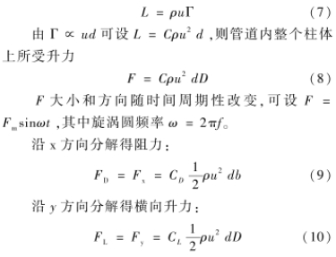 式中ρ爲流(liú)體密度,kg/m³;u爲(wèi)來流的速(su)度,m/s;r爲環量(liang),m2/s;d爲漩渦發(fā)生體💜迎面(miàn)☔寬度,mm;D爲表(biao)體通徑,mm;b爲(wei)漩渦發生(sheng)體縱向尺(chǐ)寸,mm;CD爲阻力(lì)系數,CL爲橫(héng)向升力力(li)系數。