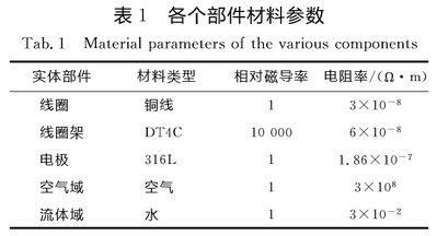有限(xiàn)元網格(ge)的質量(liàng)直接影(ying)響計算(suàn)精度,采(cǎi)用自動(dong)網格劃(hua)分,單元(yuán)形狀爲(wèi)四面體(tǐ),粗網格(ge)和細網(wang)格之間(jiān)過渡并(bing)不光滑(huá),因此将(jiāng)流體域(yu)和空氣(qì)域之間(jian)的測量(liang)管域的(de)網格單(dan)元大小(xiao)設置爲(wei)2mm。網格劃(huà)分後,導(dǎo)入Anrsys中進(jìn)行單元(yuan)類型、材(cái)料、實常(chang)數、載荷(he)、邊界條(tiáo)件和場(chǎng)路耦合(hé)單元設(she)置。線圈(quān)用銅線(xiàn)實現,匝(zā)數共6500匝(zā),其截面(miàn)積爲2.72×10-4:mm²,體(ti)積爲1.49×10-5mm3;線(xian)圈坐标(biāo)系單獨(du)定義爲(wei)局部柱(zhù)坐标系(xì),軸向爲(wei)正Y方向(xiàng),其餘部(bù)件的坐(zuo)标系使(shi)用全局(ju)笛卡爾(er)坐标系(xì),軸向爲(wei)正Y方向(xiang)。各個部(bu)件的材(cai)料參數(shu)設置見(jiàn)表1。