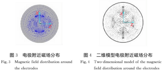 爲了保(bao)證模型(xíng)的正确(què)率,對建(jiàn)立的四(si)電極外(wài)流式電(diàn)磁流量(liàng)傳感器(qì)的三維(wéi)有限元(yuán)模型,從(cong)2個方面(miàn)進行了(le)校驗:首(shou)先,給有(yǒu)限元模(mó)型施加(jia)恒值電(dian)流激勵(li),選用靜(jìng)态求解(jie)類型,将(jiang)模型最(zui)外圈節(jiē)點的Ax,Ay,Ax自(zi)由度均(jun)設爲0,選(xuǎn)擇所有(yǒu)單元後(hòu)進行求(qiu)解,然後(hou)在後處(chù)理器中(zhong)讀入結(jié)果,畫出(chu)電極附(fù)近的磁(ci)場;分布(bu),如圖3所(suǒ)示,磁場(chang)分布符(fú)合金甯(níng)德等數(shù)值分析(xī)的結果(guo)'5],如圖4所(suo)示;其次(ci),在現有(you)模型基(jī)礎上加(jiā)密網格(ge)單元,所(suǒ)得感應(yīng)電動勢(shì)大小前(qian)後誤差(cha)小于5%,從(cong)而保證(zhèng)有限元(yuán)計算結(jié)果不受(shòu)網格質(zhi)量變化(hua)的影響(xiǎng)。綜上所(suo)述,該有(you)限元模(mo)型是準(zhun)确的,可(kě)用來進(jìn)行仿真(zhēn)研究。