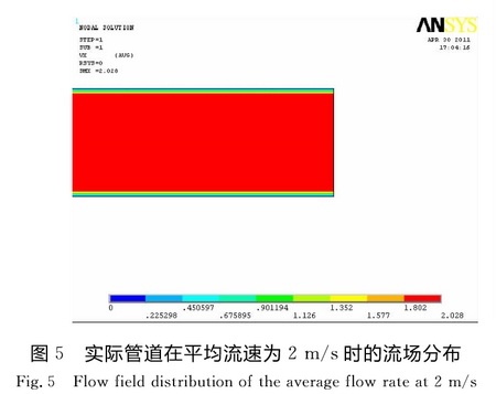 因(yin)此,當管(guǎn)道内平(píng)均流速(su)V>0.092m/s時,管道(dao)内的流(liú)動狀态(tai)爲紊流(liu);事實上(shang),四電極(ji)外流式(shì)電磁流(liú)量計在(zài)工作的(de)時候,管(guǎn)道内大(dà)多數的(de)流動速(sù)度都大(dà)于這個(ge)值。當管(guan)道内的(de)流動狀(zhuang)态爲紊(wen)流時,用(yòng)CFD軟件進(jin)行流場(chang)分析、計(ji)算,通過(guo)CFD模拟,可(kě)以分析(xi)并且顯(xian)示流體(ti)流動過(guò)程中發(fā)生的現(xian)象,及時(shi)預測流(liu)體在模(mó)拟區域(yù)的流動(dong)性能[10],用(yòng)有限元(yuán)軟件Ansys中(zhong)的FLOTRANCFD模塊(kuai)對其流(liú)場進行(hang)仿真分(fen)析,計算(suàn)結果如(ru)圖5所示(shì)。