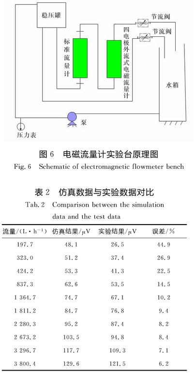 在紊流(liú)場共選(xuan)定了10個(ge)不同的(de)流量值(zhí),獨立電(diàn)壓源編(biān)程爲兩(liǎng)值矩形(xing)波,幅值(zhí)爲15V,頻率(lǜ)爲1Hz,對流(liu)量數據(ju)進行了(le)仿真計(jì)算,并在(zai)實驗台(tái)上得出(chū)了實驗(yàn)數據,實(shí)驗台采(cǎi)用精度(dù)爲0.5%的電(dian)磁流量(liang)計讀取(qǔ)流量值(zhí),用信号(hao)處理電(dian)路采集(ji)四電極(ji)外流式(shì)電磁流(liu)量計的(de)感應電(dian)動勢信(xin)号,通過(guò)串口輸(shū)入到計(ji)算機顯(xiǎn)示,實驗(yan)台原理(li)圖如圖(tú)6所示,最(zuì)後對這(zhe)2種數據(ju)進行了(le)誤差分(fèn)析,結果(guo)見表2。