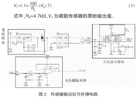信号采集包(bao)括溫度傳感(gǎn)器輸出信号(hao)獲取和磁阻(zǔ)傳感器信号(hào)💘獲取,溫度傳(chuán)感器的輸出(chū)信号通過SPI方(fang)💛式傳送給微(wei)處理器,用于(yú)對磁阻傳感(gan)器的輸出做(zuo)溫度補償,磁(cí)阻傳感器的(de)輸出🈲信号将(jiang)用于流量計(jì)算,經過信号(hào)放大處理後(hòu)直接傳送至(zhì)微✨處理器。圖(tú)2爲磁阻傳感(gǎn)🥰器輸出信号(hào)處理的硬件(jiàn)電路圖。包括(kuo)電源模塊差(chà)分放大模塊(kuai)和電壓跟随(sui)模塊。電源模(mo)塊采用恒流(liu)源給KMY20磁阻傳(chuán)感器供電,在(zai)--定程度上減(jian)🎯小✉️了溫漂對(dui)傳感器輸出(chu)的影響"。差分(fen)🔞模塊完成對(dui)傳感器輸出(chu)信号的放大(da)處理,電壓跟(gen)随模塊減小(xiao)了傳感器的(de)輸出阻抗。從(cóng)👨❤️👨圖2可知,經放(fàng)大❌處理後,傳(chuan)感器的輸出(chu)信号幅值爲(wei):