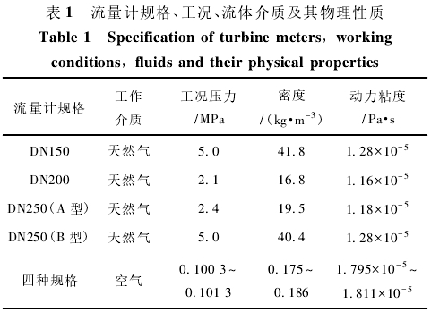 2015年至2018年,上海(hǎi)市計量測試技術(shu)研究院使用常壓(ya)空氣流量标準裝(zhuāng)置(量程2~4500m3/h,相對擴展(zhǎn)不确定Urel=0.16%,k=2))對32台進口(kǒu)渦輪流量計實施(shi)檢定,流量計入關(guān)前都經過德國國(guo)家高壓天然氣流(liu)量标準裝置(量程(cheng)3~6500m³/h,相對擴展不确定(ding)度Urel=0.12%,k=2)的實流标定。常(chang)壓空氣流量标準(zhun)裝置的量值溯源(yuán)到中國氣體流量(liang)國家基準,德國國(guó)家高壓天然氣流(liu)量标準裝置使用(yòng)的流量标準值是(shì)荷蘭法國-德國協(xié)同參考值(harmonizedreferencevalue)。根據流(liú)量計的型号規格(gé)以及标定時的工(gong)況壓力,将32台流量(liang)計分爲4組,對應的(de)工作介質及其物(wu)理性質如表1所示(shì)。标定數據經彙總(zong)整理後繪制成體(tǐ)積流量-誤差曲線(xiàn),如圖1所示。