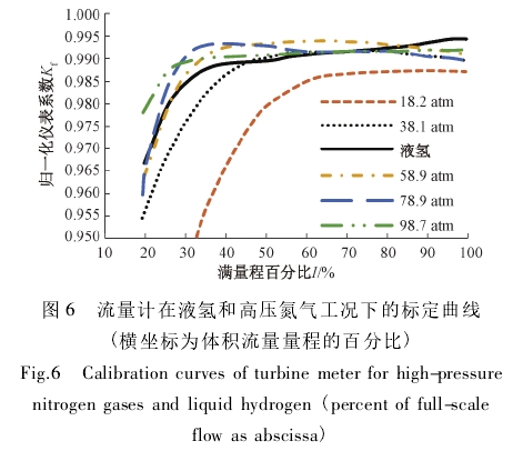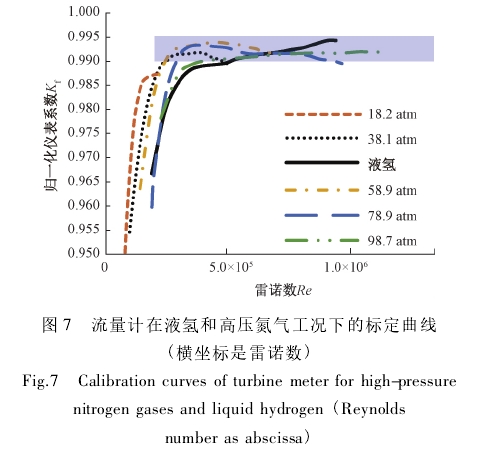 各個(gè)工況下的标定曲(qu)線如圖6所示,試驗(yàn)結果用儀表系數(shu)K,表示,原技術報告(gào)是以水标定的儀(yí)表系數作爲參照(zhao),經歸--化處理後作(zuo)爲縱坐标,橫坐标(biāo)是體積流量量程(cheng)的百分比,爲方便(bian)分析,将标定數據(jù)轉爲圖7所示(橫坐(zuò)标以雷諾數表示(shì))。物性方面,58.9和78.9atm的高(gao)壓氮氣分别與液(ye)氫的密度和運動(dong)粘度很接近,所以(yǐ)标定結果對比符(fú)合流動相似準則(ze)的要求。6組标定數(shu)據在量程的低區(qū)(<50%FS,Re<5x10')差異較大,标定曲(qǔ)線呈現出“扇形”特(tè)征,随着雷諾數上(shang)升,差異逐漸減小(xiǎo)“扇形”趨于收斂。4個(ge)高壓氮氣(工況壓(yā)力≥38.1atm)以及液氫的标(biao)定數據在量程的(de)高區很接近,5條标(biāo)定曲線聚合于一(yi)個0.5%的區間(如圖7中(zhong)帶狀部分所示)。如(ru)果以該區間作爲(wei)僅與雷諾數相關(guan)的聚合域,4條高壓(ya)氮氣标定曲線随(sui)着壓力的上升,依(yī)次進入該區間,正(zhèng)如前文的分析,工(gong)況壓力越高,進入(rù)聚合域所對應的(de)雷諾數也越大。