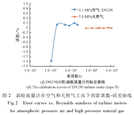 圖2所(suo)示爲。上述渦輪流(liú)量計基于雷諾數(shu)(Reynoldsnumber,Re)的誤差對比。由于(yú)渦輪流量計一般(bān)是以體積流量标(biāo)稱其量程範圍,轉(zhuan)化到雷諾數後,常(chang)壓下雷諾數量程(cheng)與高壓下雷諾數(shù)量程存在間隔,兩(liǎng)個工況壓力相差(cha)越小,間隔區間越(yuè)小,常壓雷諾數上(shàng)限的誤差與高壓(ya)雷諾數下限的誤(wù)差越接近,圖2(b)與圖(tú)2(c)中兩者相差分别(bie)爲0.24%和0.05%,可以認爲流(liú)量計的誤差幾乎(hu)随雷諾數連續變(bian)化。圖2中兩條誤差(chà)曲線沒有重疊或(huò)交集,意味着流量(liàng)計分别工作在不(bú)同的流動特征區(qū)域,無法進行常壓(ya)空氣與高壓天然(ran)氣之間的點對點(dian)誤差對比。因此,需(xū)要增加高壓空氣(qì)下的标定實驗。