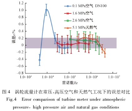4個工況下的标定(dìng)結果如圖4所示,誤(wu)差棒用各個裝置(zhì)的相對測量不确(que)定度表示。0.1MPa常壓空(kong)氣的上限雷諾數(shù)和2.6MPa高壓空氣的下(xia)限雷諾數比較接(jiē)近,各自對應的誤(wu)差相差0.24%。4個壓力工(gōng)況(0.1.1.6、2.6和5.1MPa)下的标定曲(qǔ)線包含3段明顯的(de)雷諾數重疊區域(yù),區域内兩兩曲線(xian)之間的差異小于(yu)0.2%,而且2.6MPa空氣與高壓(yā)天然氣(5.1MPa)的标定曲(qǔ)線更爲接近,點對(duì)點差異甚至小于(yu)0.1%。由于3個工況(常壓(ya)、高壓空氣和天然(rán)氣)下的實驗相互(hù)獨立,标定數據兩(liang)兩之間的差異小(xiao)于裝置間的合成(chéng)擴展不确定度,說(shuo)明渦輪流量計标(biāo)定曲線随雷諾數(shù)變化,而且随着工(gōng)況壓力增加,标定(dìng)曲線保持連續性(xing)延拓。當Re>2.95x104,各個工況(kuàng)的标定數據之間(jiān)的差異不超過0.30%,如(ru)圖4帶狀區域所示(shì),且随着雷諾數增(zeng)加,這種差異呈現(xiàn)出逐漸縮小的趨(qū)勢,曲線也逐漸相(xiang)互接近。基于渦輪(lun)流量計在高雷諾(nuo)數區域表現出的(de)這一特性,技術人(ren)員就能夠以較高(gao)的置信度估計出(chu)流量計在其他相(xiàng)近工況壓力下的(de)誤差。