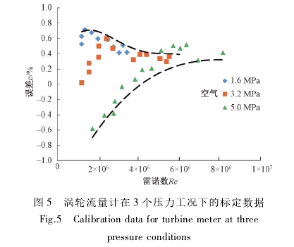 需要指出的(de)是,上述實驗是在(zai)流量計制造商限(xiàn)定的體積流量量(liang)程内進行,僅在部(bu)分雷諾數重疊區(qu)存在誤差的點對(duì)點比較,爲了擴大(da)比較範圍,有必要(yào)将标定實驗拓展(zhan)到流量計量程的(de)下限以下。爲此,在(zai)高壓空氣環道流(liu)量标準裝置的3個(gè)工況(1.6.3.2.5.0MPa)下對一台DN150的(de)渦輪流量計進行(háng)多點标定,結果如(ru)圖5所示。