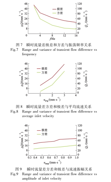 2)圓管人(ren)口與出(chu)口存在(zài)周期波(bō)動的瞬(shun)時流量(liàng)差,振蕩(dang)頻率越(yue)大或人(ren)口流速(sù)峰值越(yuè)小,則瞬(shun)時流量(liang)差的波(bō)動也越(yue)小
