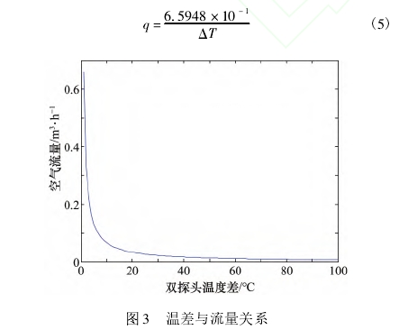 如上所示(shì),量程範圍受最(zuì)大電流限制。想(xiǎng)要拓寬量🙇♀️程,不(bú)妨将兩種方法(fǎ)相結合。在速度(du)探頭的電流達(da)到0.09A之前采用恒(heng)溫差法進行測(ce)量,在0.09A之後采取(qu)恒功率法進行(háng)測量🐅。0.09A時速度✂️探(tan)頭功耗爲0.237W,以此(ci)功耗爲恒定功(gong)耗,流過速度探(tan)頭的流量與溫(wen)度差之間的關(guan)系如式(5)和圖🚶3所(suo)示,對于溫差爲(wèi)50~100℃時具有㊙️較好的(de)靈敏度。溫差爲(wèi)50℃時,此🍉時速度探(tan)頭支路電流爲(wei)0.096A,小于最大🈲電流(liu),所測流量爲😍1.31869×10-2m3/h。