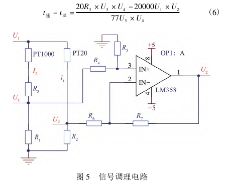 信号調理電路(lù)如圖5所示,信号(hao)調理電路相鄰(lín)兩端爲🛀PT20和PT1000,另外(wai)兩端電阻爲20Ω的(de)電阻R2和1kΩ的電阻(zǔ)R1,在PT1000電阻一🐪端有(you)❤️補償電阻📱R3,R1和R2兩(liǎng)❓端的☎️電勢差經(jīng)差分放大後爲(wèi)U2。差分放大電路(lu)中R4=R6,R5=R7。可調直流電(dian)🈲源提供電壓U1。無(wu)任何氣體流過(guo)時,速度探頭的(de)溫度比溫度探(tan)頭高100℃,補償電阻(zǔ)R3保證電橋平衡(héng),此時電勢差U2爲(wei)0,電勢差U2由AD7066芯片(pian)進行采集。R1、R2兩端(duan)電壓U3、U4由AD7066采集後(hou),除去阻值即可(ke)✏️得到速度探頭(tóu)和溫度🌈探頭支(zhī)✏️路電流I1和I2。若I1值(zhi)小于0.09A,采用恒溫(wēn)差法,根據I1值求(qiu)🐕得流量。當進氣(qi)流量增大時,速(su)🐆度探頭發🌍生熱(rè)對流,被💘氣體帶(dài)走一部分熱量(liang),溫度降低,阻值(zhi)減小,電橋平衡(héng)被打破。控制電(dian)🆚路根據電🐉勢差(cha)U2增大U1輸入,I1增大(dà)使得🤟速度探頭(tou)功耗增大,溫度(du)上升,阻值上升(shēng),電橋重新平衡(héng);而當進氣流量(liàng)減小,速度探頭(tóu)溫度升高,阻值(zhí)增加,則減小✔️U1輸(shu)入,減小I1,減小速(sù)度探頭功耗,速(su)度探頭溫度降(jiàng)低,阻值減小👉,電(diàn)橋重新平衡。若(ruò)I1值大于0.09A,采用恒(heng)功率法進行測(cè)量,根據溫度差(cha)求得流量。進氣(qì)流量增大,速度(du)🙇🏻探頭溫度降低(di),阻值減小,功耗(hào)增大,減小U1輸入(ru),使得速度探頭(tou)功耗維持定值(zhí);進氣流量減小(xiao),速度探頭溫度(du)升高,阻值增大(dà),功耗減小,增大(dà)U1輸🌈入,使得速度(dù)探頭功耗維持(chí)定值。溫度差公(gong)🔴式如式(6)所示。