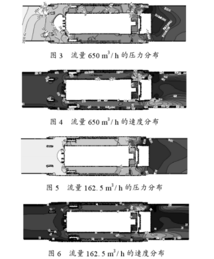 該(gāi)次數值模拟流(liú)量爲650,260,162.5,32m/h的情況,以(yǐ)下選取其中兩(liang)種情況進行分(fen)析。如圖3和圖4所(suo)示,爲流量650m³/h時的(de)z平面上的壓力(li)(Pa)和速度(m/s)分布🔱圖(tú)。從圖3可以明顯(xian)看出渦輪流量(liàng)計的壓力損失(shi)主要集中在前(qian)後導流器和葉(ye)輪部分,而在其(qí)他部位🙇🏻的壓力(lì)損㊙️失很小;速度(du)分布圖也很好(hǎo)地反㊙️映出渦輪(lun)流量計内部的(de)流動情況。從🔞流(liú)量.162.5m³/h時的壓力(Pa)和(he)速度(m/s)分布圖🈲,如(ru)圖5-6所示,可以得(de)到相同的結❗論(lun),兩種流量下,壓(yā)力和速度是相(xiang)似的,但大小有(you)所不同。