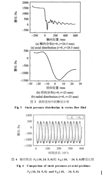 爲了定(ding)量比較(jiào)渦街流(liú)場空間(jian)中不同(tong)位置處(chù)靜壓的(de)🥰大小,圖(tú)3給出了(le)靜壓在(zài)計算域(yu)中平行(hang)流向的(de):=0,y=245mm和👄垂直(zhí)流向的(de):=0,x=25mm兩條直(zhi)線上的(de)計算結(jié)果。可以(yǐ)看到,渦(wo)🌈街流場(chǎng)中靠近(jin)旋渦發(fa)生體管(guan)壁處的(de)靜壓有(you)較明♊顯(xiǎn)的波動(dòng),,沿流動(dòng)方向靜(jing)壓在0~50mm區(qū)間内波(bō)動明顯(xian)、幅度最(zui)大,即在(zài)💰距離旋(xuan)渦發生(shēng)體一定(dìng)範㊙️圍内(nèi),越靠近(jìn)旋渦發(fa)生體,靜(jing)壓幅度(du)越大;而(ér)👉在垂直(zhi)流動方(fāng)向上管(guǎn)道内壁(bì)處的靜(jing)壓也具(ju)有較大(da)的❗幅度(du)。圖4給出(chū)了計🧑🏾🤝🧑🏼算(suan)域中:=0平(ping)面上一(yi)對軸對(dui)稱管壁(bi)處監測(ce)點P1(10,245,0)和Pi(10,24.5,0)靜(jìng)壓的計(jì)算值。從(cong)圖中可(ke)以看出(chū):管壁處(chu)軸對稱(cheng)☁️的2點靜(jìng)壓波動(dong)的幅度(du)和頻率(lǜ)相等而(er)相位相(xiàng)💁反,因此(ci),若💞在靠(kào)近旋渦(wo)發生體(tǐ)的軸對(dui)稱管壁(bi)上設置(zhi)兩個取(qǔ)👌壓點測(ce)量差壓(ya),則可構(gòu)成差動(dòng)結構,獲(huo)得的信(xìn)号更強(qiáng)便于檢(jian)🐅測,通過(guò)測得的(de)靜壓差(cha)🌈可以🏃檢(jian)測管内(nèi)渦街流(liu)動特性(xìng)。