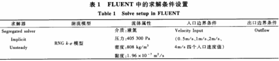 爲了能(néng)夠計算(suan)得到流(liú)場的正(zheng)确解,必(bi)須給定(dìng)合理的(de)邊界條(tiao)件和流(liu)體物性(xing),并選擇(ze)合适的(de)求解器(qi)和計算(suàn)模型。渦(wō)街流場(chang)爲非定(dìng)常流動(dong),雷諾數(shu)較高,對(duì)渦街流(liú)場仿真(zhēn)的求解(jie)條件如(rú)表1設置(zhi)。
