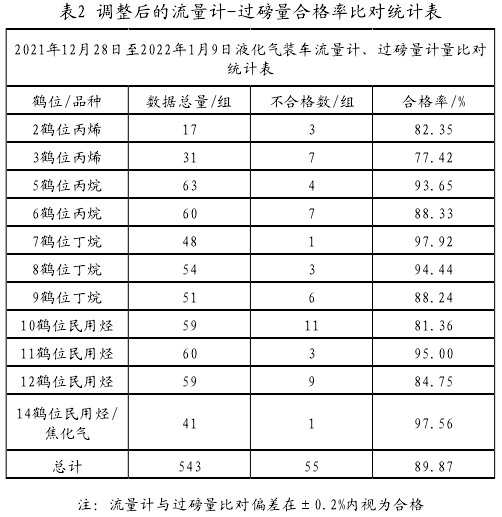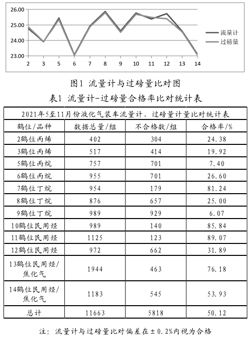 摘要:煉油廠的液(yè)化石油氣主要組(zu)成部分爲丙烷📞、丙(bǐng)烯、丁🍉烷、延遲焦化(hua)液化石油氣等,由(you)于其飽和蒸汽壓(ya)💋較高,容易導緻氣(qì)液兩相共存,因此(ci),煉油廠的♊液化石(shí)油氣産品一直是(shi)通過汽運過磅的(de)形式進✊行出廠計(jì)量。随着時代的發(fa)展,客戶對便捷、速(su)度的要求,流量計(ji) 計量逐漸成爲迫(pò)切的需求。本文針(zhen)對液化氣出廠從(cóng)過磅計量到流量(liàng)計計量的轉變過(guo)程中遇到的問題(tí)進行探索和分析(xi),爲實際應用提供(gòng)理論和技術方面(miàn)的指導。 前言 科氏(shi)質量流量計作爲(wei)一種可以直接測(cè)量流體質量☀️流🏃🏻量(liang)的精度高儀表,具(ju)有無可動部件和(hé)密封件⛹🏻♀️、測量精度(du)受介👅質溫度、壓力(lì)及密度參數影響(xiǎng)小的特點平,同時(shí)由㊙️于流量檢測中(zhōng)常用的流體物性(xing)參數主要有👄密度(dù)、粘度、壓縮系數💛、比(bi)熱比和氣體絕熱(re)指數,因此科氏質(zhì)量流量計不僅應(ying)用于石油行業🏃🏻♂️,例(li)如利用科氏💋質量(liàng)流量計和低含水(shuǐ)分析儀計量⭐外輸(shu)原油的純油🌂量中(zhong);在轉油站使用質(zhì)量流量計,用于各(gè)個計量站原🚩油的(de)外輸計量和含水(shui)分析。通過質量流(liu)量計對原油的流(liu)量🥵、密度進行測量(liàng),然後🐕用密度法算(suàn)出含水率,進💋而得(de)出純油量[3];同樣也(yě)廣泛應用于化工(gong)生産中,比如🙇♀️用于(yu)測量工藝管道中(zhong)流經的各種單獨(dú)介質的流體、各種(zhong)漿液、非牛頓流體(ti)、有足夠🌈密度的中(zhong)高壓氣體、高黏度(du)流體、含有微量氣(qì)體的液體🔞、懸浮液(yè)等,能夠充分💜滿足(zu)石油化工生産裝(zhuāng)置對質量流量的(de)計量要求。因此科(kē)氏質量流量👉計較(jiào)其他流量計具有(you)明顯的優勢,它不(bú)僅是提高産品質(zhì)量的保障,而且是(shi)♍企業提高經濟效(xiào)益的重要手段5I,逐(zhu)步爲客戶所接受(shou)。但由于石油液化(huà)氣爲非均勻混合(he)液體(例如✉️含水液(ye)化氣),易造成流🔞量(liang)計測量管内部介(jie)質質量分布不均(jun1),造成測量誤差。因(yin)此,石油液化氣利(lì)用科氏質量流量(liang)計出廠一直是一(yi)個難點。 1.項目背景(jing):過磅出廠與裝車(che)流量計的數據比(bi)對 廠内液化氣出(chu)廠一直采用汽車(che)衡出廠的計量方(fāng)式。2025年12月15日至12月15日(ri),将流量計裝車數(shù)據與過磅量進行(hang)數☂️據比✨對,部🙇🏻分比(bi)對結果如圖1。 在此(ci)期間共采集液化(huà)氣裝車台2~14鶴位流(liu)量計一汽車衡計(jì)量比對數據11663組,結(jié)果發現其中不合(he)格數據有5818組,數據(ju)合格㊙️率爲50.12%,如表1所(suǒ)示。 從圖中的數據(jù)分析,流量計與過(guò)磅量的差距較大(da),流量計本身的計(jì)量還達不到貿易(yì)交接的要求。經過(guo)現場勘查發現,科(kē)氏質👈量流量計本(ben)身檢定完畢後,直(zhí)接回裝,并未按照(zhào)🐉現場的實際工況(kuàng)進行溫壓🍉補償,與(yǔ)此同時,部分鶴位(wèi)流量計的安裝👣有(you)應力的影響。結合(he)比對數據及現👣場(chǎng)分析,接下來對每(měi)個鶴位的流量計(jì)進行了溫壓補償(chang)、消除應力,同時也(ye)對流量計部🔴分參(can)數進行了相應的(de)調整。調整後,流量(liàng)計與過磅量的部(bù)分👣比對數據,見圖(tu)(2)。 調整後,流量計與(yǔ)過磅量差量減小(xiao),再次收集流量計(jì)與過磅量的比對(dui)數據543組,其中不合(hé)格數據55組,數據合(he)格率89.87%,相比調整前(qian)數據合格率提升(sheng)39.75%,如表2所示♋。 2.影響數(shù)據合格率的因素(su) 從上述兩次的比(bi)對統計表可以看(kan)出,雖然合格率有(you)所提升,但還沒有(you)達到使用流量計(ji)進行貿易交接的(de)條件㊙️。經過🈲一個🔴多(duo)月現場裝車調研(yán),發現影響數據比(bi)對的合格率不僅(jǐn)與儀表安裝😄應力(li)、溫壓補償有關,也(yě)受現場裝車操作(zuo)、工藝操作、汽車衡(héng)本身🌈精度等多方(fāng)面影響。 (1)現場裝車(che)操作的影響 液化(hua)氣類産品裝車是(shì)一個典型的采用(yong)常壓開放式鶴位(wèi)裝車,槽車開至所(suo)分配的鶴位,車輛(liàng)停穩熄火後,由裝(zhuang)車操作人員将鶴(he)管放置到槽車底(di)部,同時将防靜電(diàn)接地夾夾在槽車(che)上。完成⭕準備工作(zuò)後,操作人員在鶴(he)位批控器上輸入(ru)裝車密.碼,打開氣(qì)💁動二段式裝車球(qiú)閥,開始裝車。開始(shi)時裝車閥打開一(yi)半開度,以低流速(sù)裝車,5s以後,裝車閥(fa)全部打開。然後根(gēn)據現🥵場實際工況(kuàng),随時調節流量,做(zuo)好錯車準備。達到(dào)預裝量後,人工或(huo)者自動關閉📐批控(kong)器,完成裝車。從上(shang)述裝車流程💰可以(yǐ)看出,實際裝車時(shi),由于💰系統管線壓(ya)力與槽車内❄️.壓力(lì)相差較大,很容易(yì)引起液化氣汽化(hua),而質量流量計在(zài)氣液兩相時無法(fǎ)⁉️正常❓計量,易造成(cheng)數據偏差,而且不(bú)同的裝車人員🔴有(yǒu)不同的操作習慣(guan),這些因素都會影(ying)響流量計數👅據的(de)正确率,因㊙️此,規💯範(fan)裝車操作是面臨(lín)的第一💛個🛀問題。 (2)工(gong)藝操作對數據的(de)影響 一旦使用流(liú)量計進行結算,也(yě)将對工藝操作提(tí)出新❌的
