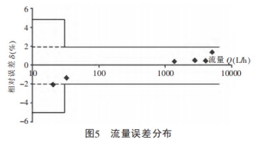 經過上述測(ce)量方法與數(shù)據處理後的(de)DN20管徑試驗樣(yang)機測量結果(guo)🔴如表1所示。從(cóng)表中可以看(kàn)出,在常用流(liu)量Q3(4000L/h)内,流量傳(chuán)感器具有很(hěn)好的流量特(te)性,在R200範圍内(nèi)相對誤差≤2%,在(zài)R160範圍内相對(duì)誤差≤1%。其流量(liàng)誤差分布如(rú)圖5所示,在全(quán)流量範圍内(nèi),測量誤差全(quán)部在MPE(最大允(yun)🛀許誤差)内。