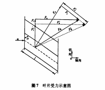 葉(yè)輪受力(li)分析見(jian)圖7,u爲來(lái)流速度(dù),Ɩ爲葉片(piàn)長度,ω爲(wèi)葉輪旋(xuán)轉角速(sù)度。Fa、F1分别(bié)爲流體(tǐ)對葉輪(lún)的軸向(xiang)力和圓(yuán)周力,FR爲(wèi)二者的(de)合力;Fg、Fy分(fèn)别🔞爲FR在(zai)與葉片(pian)平行方(fāng)向上的(de)分量和(hé)與葉片(pian)垂直方(fāng)向上的(de)分量,稱(chēng)Fs爲葉輪(lun)阻力,Fy爲(wèi)葉輪升(shēng)力。
