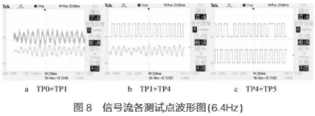 本(ben)設計在50mm口(kǒu)徑渦街流(liu)量計實驗(yàn)裝置上進(jìn)行試驗。圖(tú)8所示👨❤️👨爲信(xin)号流各測(cè)試點波形(xíng)圖。圖8a上方(fāng)的波形爲(wei)前置放🎯大(da)後.輸出的(de)波形(TPO),壓電(dian)傳感器輸(shū)出的差分(fèn)信号經前(qian)置儀表放(fàng)大器輸出(chu)轉換後,得(dé)到的正弦(xian)信号,但信(xin)号信噪比(bǐ)相對較⛱️差(chà);下方的波(bō)形爲經過(guo)測量通道(dào)濾波輸出(chu)之後的波(bo)形(TP1),經過濾(lü)波去噪☀️放(fàng)大處理,得(de)到的高信(xin)噪比信号(hao)。圖8b下方波(bo)形即是經(jing)過測量💞通(tong)道濾波輸(shū)出之後的(de)波形(TP1);上方(fāng)波形爲經(jīng)過軟件脈(mò)沖整形🌈之(zhī)後輸出的(de)方波信号(hào)(TP4),對于峰峰(fēng)值大于設(she)定阈值的(de)🈲模拟信号(hao),軟件脈沖(chong)整📧形都能(neng)正确輸出(chū)方波。圖8c.上(shang)方波形即(ji)爲經過軟(ruan)件脈沖整(zheng)形之後輸(shu)出的方波(bo)信号🈲(TP4),因爲(wèi)有存在小(xiao)于脈沖整(zhěng)形阈值的(de)信号,緻使(shi)輸出方波(bo)存在缺波(bo)現象;下方(fāng)波形爲經(jing)過功率最(zuì)大頻率點(dian)周期估計(ji)之後輸出(chu)的波形(TP5),通(tōng)過軟件濾(lü)波最大程(cheng)度的複原(yuan)了真🐅實💚的(de)信号波形(xíng),保證了測(ce)量精度。