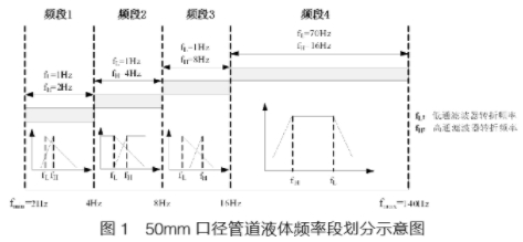在低頻段(duan),渦街信号(hao)經過相同(tóng)轉折頻率(lü)的低通濾(lü)波器,輸出(chu)幅🐇值爲常(chang)數;在高頻(pin)段,低通濾(lǜ)波器轉折(she)頻率後移(yí),使低通濾(lü)波器基本(běn)放開。圖1爲(wèi)50mm口徑管道(dào)✊液體的🆚頻(pin)率段劃分(fèn)示意圖。此(cǐ)四頻段信(xìn)号處理方(fang)✏️法構成的(de)“測量通道(dào)”是整個渦(wō)街信号處(chu)㊙️理體系的(de)主體通道(dào)。