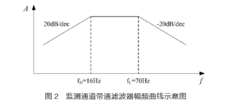 爲監測信(xin)号由低頻(pín)突變爲高(gāo)頻時的狀(zhuàng)況,本文設(shè)計🌈了一個(ge)由轉折頻(pin)率爲fL=fmax/2=70Hz的一(yi)階低通濾(lǜ)波器與轉(zhuǎn)折頻率爲(wèi)fH=8*fmin=16Hz的一階高(gāo)通濾波器(qi)組成的帶(dai)通濾波器(qì)作爲“監測(cè)通道⚽”。圖2爲(wei)“監👉測通道(dao)”的幅頻曲(qu)線示意圖(tu)。