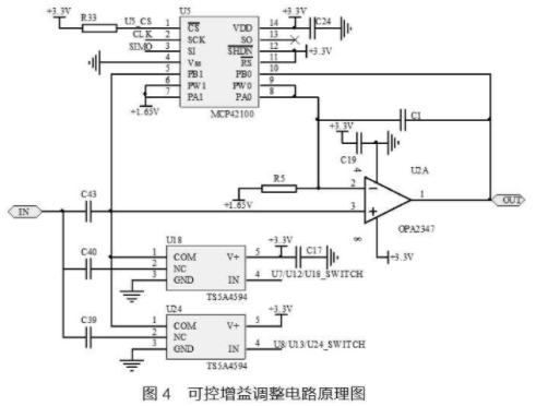可(kě)控增益調(diao)整電路由(yóu)一個階高(gao)通濾波電(diàn)路和一個(ge)可調增益(yì)的同相放(fang)大器組成(chéng)。以此來配(pèi)合測量通(tong)道,發揮儀(yí)表的寬量(liang)程優勢,完(wan)成回路的(de)閉環自動(dong)增益調整(zheng)。如圖4,U5爲256抽(chōu)頭100kQ2數字電(diàn)位器,C43.,C40.,C39電容(róng)通過模拟(nǐ)開關選通(tong)不同的組(zu)合,形成具(jù)有隔直和(hé)分頻段濾(lü)波作用的(de)轉折頻率(lü)可控的一(yi)階高通濾(lǜ)波器。同相(xiàng)放大器的(de)放大倍數(shù)爲1+RP0/R5。