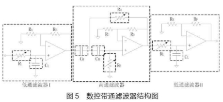 測量通(tong)道是整個(ge)硬件系統(tǒng)的核心部(bù)分,包括數(shu)控帶通濾(lǜ)🌍波🤩器和硬(yìng)件脈沖整(zhěng)形電路,以(yi)此完成信(xìn)号的濾波(bo)處✊理和脈(mò)沖整形任(rèn)務。數控帶(dài)通濾波器(qì)由兩個具(ju)有相同的(de)轉折頻率(lü)的⚽一階低(dī)通濾波器(qi)和一個二(èr)階高通濾(lǜ)波器組成(chéng),如圖5所示(shì)。