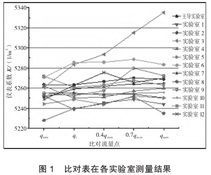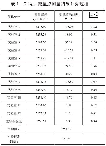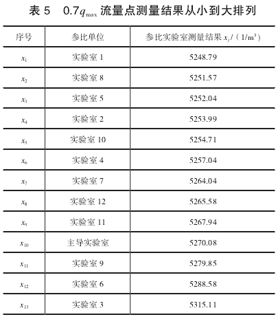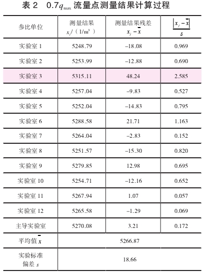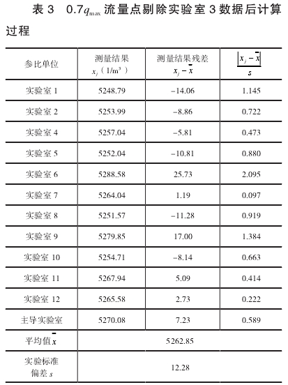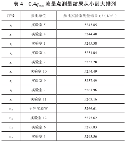 随着天然(rán)氣計量技術的(de)發展和對天然(ran)氣貿易交接計(ji)量要求的提高(gāo),流量計的正确(què)計量顯得至關(guan)重要。在此背景(jǐng)下,某省組織開(kai)展了全省氣體(tǐ)渦輪流量計 計(jì)量比對工作,以(yi)确保全省量值(zhí)統一、正确、可靠(kào),促進計量技術(shù)機構能力提升(sheng)。 比對選用了一(yi)台DN150mm氣體渦輪流(liu)量計作爲傳遞(dì)标準,流量範圍(wéi)爲(80~1600)m³/h,精度等級爲(wèi)1.0級。其中0.4qmax=640m³/h、.0.7qmax=1120m³/h爲比對(duì)流量點,每點檢(jian)測6次,測得其儀(yí)表系數K,取6次平(píng)均值作爲比對(dui)值。 本次比對,各(gè)參比實驗室完(wan)成率爲100%,比對完(wan)成後,主導實驗(yan)室對各參比實(shi)驗室的數據進(jìn)行了彙總統計(ji),各實驗室測量(liàng)結果如圖1所示(shi)。由圖1可以看出(chū),實驗室3的測量(liang)結果随着流量(liàng)增大而增大,與(yǔ)其他參比實驗(yan)室的測量結果(guo)産生了較大偏(pian)移,需進行異常(chang)值判别。 一、異常(chang)值判别常用的(de)統計方法 判别(bié)測量結果異常(cháng)值常用的統計(jì)方法有拉依達(da).準則(3σ準則)、格拉(lā)布斯準則、狄克(kè)遜準則等。-般來(lai)說,在重複觀測(cè)次數n>50的前提下(xia),可以考慮使用(yong)3σ準則,但在GB/T4883-2008《數據(jù)的統計處理和(hé)解釋正态樣本(běn)離群值的判斷(duàn)和處理》中已不(bu)采用此方法;在(zai)3<n<50的情況下,格拉(la)布斯準則效果(guo)較好,适用于單(dān)個異常值;有多(duo)于一個異常值(zhí)時,選用狄克遜(xun)準則較好。 二、氣(qì)體渦輪流量計(jì)計量比對數據(jù)中異常值判别(bie) 在此次氣體渦(wo)輪流量計計量(liàng)比對工作過程(chéng)中,異常值需要(yao)慎重處理。爲避(bì)免異常值的遺(yi)漏和測量真值(zhi)的誤判,可以綜(zōng)合運用多種判(pan)定方法處理異(yì)常值。考慮比對(dui)工作的重要性(xing),此次異常值判(pàn)别選用格拉布(bu)斯準則和狄克(ke)遜準則同時進(jìn)行,選.用格拉布(bù)斯準則判别異(yì)常值,并用狄克(ke)遜準則判别以(yǐ)作驗證。 1.格拉布(bu)斯準則 設在一(yī)組重複觀測值(zhí)xi中,其殘差vi的絕(jué)對值lvil最大者爲(wei)可疑值xd,在給定(dìng)的包含概率爲(wèi)p=0.95或p=0.99,也就是顯著(zhe)性水平爲α=1-p=0.01或0.05時(shí),如果滿足式(1),可(kě)以判定xa爲異常(cháng)值。 式中:G(α,n)一與顯(xiǎn)著性水平α和重(zhong)複觀測次數n有(yǒu)關的格拉布斯(si)臨界值,查格拉(la)布斯準則臨界(jiè)值G(α,n)表可得;s一測(cè)量結果的實驗(yàn)标準偏差。 本次(ci)計算中,測量結(jié)果平均值`x和實(shí)驗标準偏差s以(yi)算術平均值計(jì)算,步驟如下: (1)0.4qmx流(liú)量點 計算過程(chéng)如表1所示。參比(bǐ)實驗室`x值的算(suan)術平均值爲x=5261.28。 實(shí)驗标準偏差爲(wèi) 計算各個測量(liang)結果的殘差xj-`x,其(qí)中絕對值最大(da)的殘差爲32.28,相應(ying)的測量結果可(ke)疑值爲x3=5293.6。按置信(xìn)水平P=95%=0.95,即α=1-0.95=0.05,n=13,查格拉(la)布斯準則的臨(lin)界值表得到G(0.05,13)=2.331,則(ze) 可以判定實驗(yan)室3在0.4qmax.流量點的(de)測量結果不屬(shǔ)于異常值,不需(xū)要剔除。 (2)0.7qms流量點(dian). 計算過程如表(biǎo)2所示。參比實驗(yan)室K值的算術平(píng)均值爲`x=5266.87。 實驗标(biāo)準偏差爲 計算(suàn)各個測量結果(guǒ)的殘差,其中絕(jue)對值最大的殘(cán)差爲48.24,相應的測(ce)量結果可疑值(zhi)爲X3=5315.11。按置信水平(ping)P=95%=0.95,即α=1-0.95=0.05,n=13,查格拉布斯(sī)準則的臨界值(zhi)表得到 可以判(pàn)定實驗室3在0.7qmax流(liu)量點的測量結(jie)果屬于異常值(zhi),需要剔除。剔除(chú)後,12組數據重複(fu)上述過程,計算(suan)結果如表3所示(shì),置信水平P=95%,即α=1-0.95=0.05,n=12,查(cha)格拉布斯準則(ze)的臨界值表得(de)到G(0.05,12)=2.285,可以判斷無(wú)異常值。 2.狄克遜(xun)準則驗證 設,所(suo)得的重複觀測(cè)值按由小到大(da)的順序排列爲(wèi)X1,X2.....,xn。按以下4種情況(kuang)計算統計量γij,或(huò)γij' (1)在n=3~7的情況下: (2)在(zài)n=8~10的情況下: 判斷(duàn)異常值的狄克(ke)遜準則爲 若γij>γij',ry>D(α,),則(ze)xn爲異常值。 若γij>γij',ry>D(α,),則(zé)x1爲異常值。 式中(zhōng):D(α,n)一狄克遜臨界(jie)值,查狄克遜檢(jiǎn)驗的臨界值D(α,n)表(biao)可得。 本次計算(suan)的具體步驟如(ru)下: 測量次數n=13,将(jiang)各實驗室測量(liàng)結果按從小到(dào)大的順序排列(liè)爲x1,x2,....X13。按置信水平(píng)P=95%,即α=1-0.95=0.05,n=13,查狄克遜準(zhǔn)則的臨界值表(biao)得到G(0.05,13)=0.557。 在n=11~13的情況(kuang)下: 若γ21>γ21',γ21>D(α,n),則xn爲異常(chang)值。 若γ21>γ21',γ21>D(α,n),則x1爲異常(chang)值。 否則沒有異(yi)常值。 (1)0.4qmax流量點 0.4qmax.流(liú)量點的測量結(jie)果如表4所示。 由(yóu)于是屬于n=11~13的情(qing)況,所以統計量(liàng)計算如下 γ21>γ21',則 γ21=0.3655<D(0.0513)=0.557 可(ke)以判定實驗室(shì)3在0.4qmax流量點的測(cè)量結果X13=5293.56不屬于(yú)異常值,不需要(yao)剔除。 (2)0.7qmax流量點 0.7qmax流(liu)量點的測量結(jié)果如表5所示 由(yóu)于是屬于n=11~13的情(qíng)況,所以統計量(liang)計算如下 γ2>γ21',則 γ21=0.5549<D(0.05,13)=0.557 可(ke)以判定實驗室(shì)3在0.7.流量點的測(ce)量結果X13=5315.11不屬于(yú)異常值,不需要(yào)剔除。 三、異常值(zhi)判别結果分析(xi) 綜上,考慮比對(duì)工作