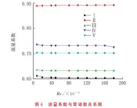 由圖(tu)6可知,雷諾數的變(bian)化對流量系數影(ying)響不大,說明這幾(ji)種孔闆都具有良(liáng)好的穩定性。外凹(ao)型孔闆II的流🌈量系(xì)數比其他🙇🏻4種大,标(biāo)準孔闆I小;加厚型(xing)孔闆IV的流量系數(shu)曲線在較大及較(jiao)🌍小雷諾數時變化(huà)明顯,因此該類型(xing)穩定性稍差;直邊(biān)型孔闆V穩定性好(hao)。