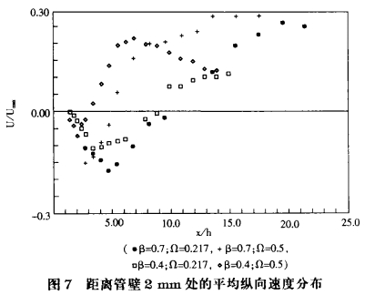 摘要:本文介紹旋(xuán)渦流對孔闆流量(liang)計 性能影響的結(jié)果。主要對β值和旋(xuán)渦強度進行了分(fèn)析。該項工作生要(yào)基于流動圖形測(ce)試法、IDA激光多普勒(lè)測速和管壁壓力(lì)測量法,借助一個(gè)流體動力學裝置(zhi)完成的。另外,還對(duì)管内流動與△p差壓(yā)測量之間的關系(xi)進行了FENXI 。 概述 該工(gōng)作的主要目的,一(yī)方面是更好地了(le)解孔闆兩側的穩(wen)定流和不穩定流(liú)現象,另一方面是(shì)确定上遊流動幹(gàn)擾對内部流動特(tè)性和對流量測量(liang)的實際影響。爲了(le)達到上述目的,采(cai)用了多種試驗和(hé)數值計算方法。 在(zai)試驗中,采用了流(liu)動圖像法,激光多(duō)普勒測速儀(L.D.V)測量(liang)二維速度和管壁(bi)差壓測量法。 試驗(yan)時,選取了2個β值(0.4和(hé)0.7)。雷諾數(Uv·D/v)在104~2×105之間。 二(er)、試驗設備 1.試驗裝(zhuāng)置 圖1爲試驗裝置(zhi),主要由水平試驗(yan)管路及一台離心(xin)泵組成。該離心泵(beng)通常在過壓狀态(tai)下運行。試驗時,由(yóu)離心泵将水箱A(容(róng)積爲1m³)中的水抽出(chu),其最大排量爲140m³/h,輸(shū)出相對壓力爲20m水(shui)柱。由泵輸送的水(shuǐ),一部分通過主試(shi)驗管路的試驗段(duàn),另-部分經旁通管(guǎn)路返回到原來的(de)水箱中。主試驗管(guan)路是一段口徑爲(wei)125mm的直管段,一台标(biao)準電磁流量計安(ān)裝在該直管段上(shàng),其準确度爲1%。該直(zhí)管段的末端與密(mì)閉水箱B相連,這樣(yang)可以消除由離心(xīn)泵引起的任何脈(mo)動流影響。在水箱(xiang)B的出口裝有口徑(jìng)爲100mm的直管段,其中(zhōng)測試段就安裝在(zai)此直菅段上。試驗(yan)中,水返回到水箱(xiang)A或者被排出。另外(wài),試驗時還可向水(shui)中注人染料。利用(yòng)2個并聯安裝在試(shì)驗段下遊的控制(zhi)閥來調節通過試(shi)驗段的水流量。爲(wei)了避免試驗過程(cheng)中水介質的溫度(du)上升,設置了一台(tai)循環水式換熱器(qì)。在環路中冷卻水(shuǐ)的流量采用伺服(fú)控制,其溫度偏差(cha)在±0.5C範圍内。試驗段(duàn)上遊口徑100mm直管段(duan)的長度爲4m,在其人(rén)口安裝了一台管(guǎn)束式整流器。試驗(yàn)段由孔闆兩側分(fèn)開,分爲上遊和下(xià)遊試驗段。試驗管(guǎn)段采用有機玻璃(li)透明管段,以便觀(guān)測流型和激光多(duō)普勒測速。由于在(zài)空氣和有機玻璃(li)管段之間存在讀(dú)數偏差,爲了避免(miǎn)有機玻璃管段産(chan)生的折射,而将有(yǒu)機玻璃管段的外(wai)壁做成平面。爲了(le)更好地觀察孔闆(pan)兩邊的流動狀态(tài),孔闆兩側的法蘭(lán)是經過特殊的,盡(jin)量保證爲0.15D。孔闆上(shang)、下遊的直管段長(zhǎng)度爲0.5m。這樣就可完(wan)成孔闆兩側回流(liú)區的試驗:甚至β值(zhí)爲0.4也可以。 2.旋渦流(liu)發生器 旋渦流是(shi)由一種切向流發(fā)生器産生的,如圖(tú)2所示。部分流體從(cong)其人口沿着與軸(zhóu)線成切線方向進(jin)人,從而産生旋轉(zhuǎn)流。旋渦強度的确(què)定借助于軸向流(liú)量Q軸向和總流量(liàng)Q總流量之間的關(guan)系來定。即用無量(liang)綱旋流系數Q表達(dá),其變化範圍爲0(無(wu)旋流)至1(最大旋流(liu)),數字表達式爲: 據(jù)有關文獻介紹,旋(xuan)渦強度也可用旋(xuan)渦數量s來表示,即(ji)通過平均軸向分(fèn)布U(r)和平均切向分(fen)布W(r)計算出來,表達(dá)式爲: 該旋流系數(shù)n可以通過試驗與(yu)經典的旋流數S用(yòng)線性關系聯系起(qi)來。 三、試驗結果 在(zài)試驗過程中,β值爲(wèi)0.7和0.4,雷諾數爲100000。 1.流動(dòng)狀态觀測 在與管(guǎn)道同直徑的孔闆(pǎn)的邊緣處設置2個(gè)毛細管,并且與管(guan)道的軸線對稱。試(shi)驗時,向兩根毛細(xì)管中注人示蹤劑(ji)(氣體或液體),觀測(ce)孔闆下遊的流動(dong)狀态。爲了清晰地(di)觀察流動狀态,在(zai)透明管段上遊放(fang)置一照明設備,其(qí)光束可以與軸線(xiàn)平行或垂直。 觀察(chá)結果表明,旋渦流(liu)使得射流擴大而(er)回流區減小。而且(qiě),當旋流系數n較大(da)和β值較小時,孔闆(pan)下遊處有明顯的(de)射流沖擊,使得作(zuo)用在管壁上的壓(yā)力産生很大的波(bo)動。. 2.速度測量 試驗(yan)中,使用了一台二(èr)維激光多普勒測(ce)速儀。在旋流強度(dù)Ω爲0.2和0.5時,進行了測(cè)試。 3.上遊流動狀态(tai) 圖3示出了在孔闆(pǎn)上遊1D處測得的平(ping)均軸向速度U和切(qiē)向速度W的分布情(qing)況。 從中可以看出(chū),随着旋渦強度的(de)增加,軸向速度U分(fèn)布趨于變平。 從切(qie)向速度分布圖中(zhōng)可以看出,旋轉以(yi)管道軸線 爲中心(xīn)并分爲兩個區域(yu)。在管道的中心(0≤r/D<0.25)爲(wei)“強旋渦型”區,在該(gai)區内切向速度W與(yǔ) 半徑r成正比。接近(jìn)于管壁時,出現了(le)一個由于摩擦 使(shi)得旋轉速度降低(dī)的區域。 利用上述(shù)的速度分布圖,可(ke)以計算出旋渦數(shù)s和旋渦角θs。因此,當(dāng)Ω=0.2時,S=0.1、θs=9°;當Ω=0.5時,S=0.5、θs=36°。 4,下遊流動(dong)狀态 (1)沿管道軸線(xiàn)的軸向速度展開(kāi)圖 當β值爲0.4時,得到(dao)的曲線如圖4所示(shi)。從圖中可以清楚(chu)地看出,旋轉流不(bú)僅可以導緻孔闆(pǎn)附近處.速度增加(jiā),而且還可導緻由(you)于下遊稍遠處因(yin)旋轉運動射流的(de)擴展使得速度迅(xùn)速地減小。當下遊(you)旋轉運動較強(上(shàng)遊旋