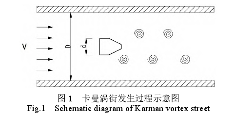 渦(wō)街流量計是基于(yu)卡曼渦街原理進(jin)行測量,在均勻流(liú)體中,垂直設置阻(zǔ)流體,在一定流速(sù)範圍内,從阻流體(ti)兩側交替地釋放(fàng)方向相反的旋渦(wo),這種不對稱漩渦(wō)稱爲卡曼渦街向(xiàng),如圖1所示。